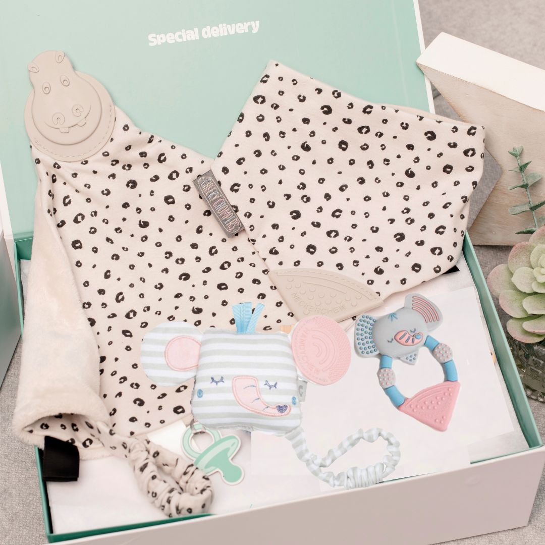 A beautiful, practical and stylish new baby gift set for that special little one in your life, whether its for a baby shower, a newborn or a teething tot!