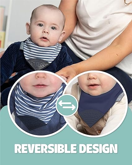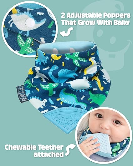 Perfect combo of designs! This award winning chewy teething dribble bib is packed with smart features to safely ease your baby's teething troubles away.