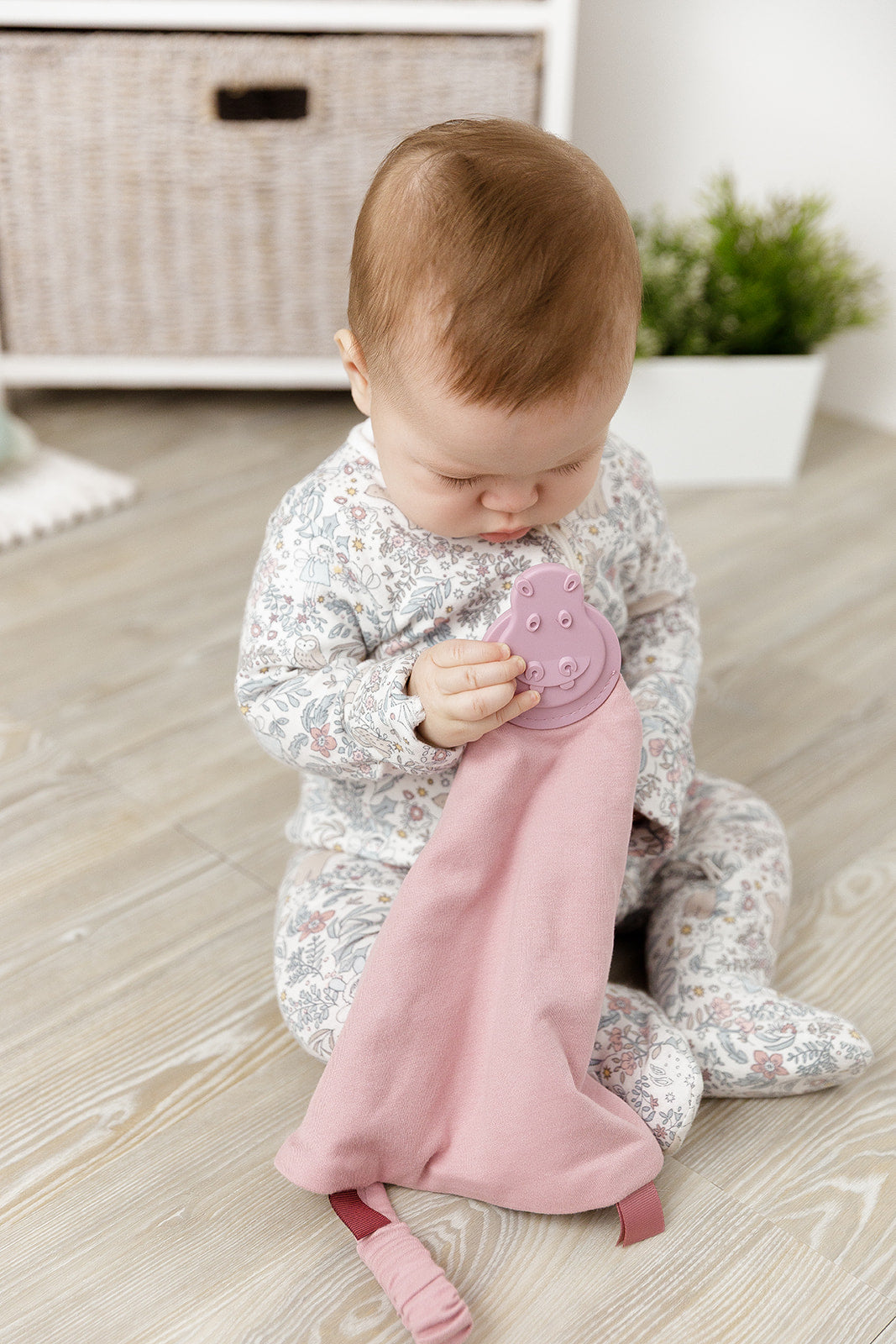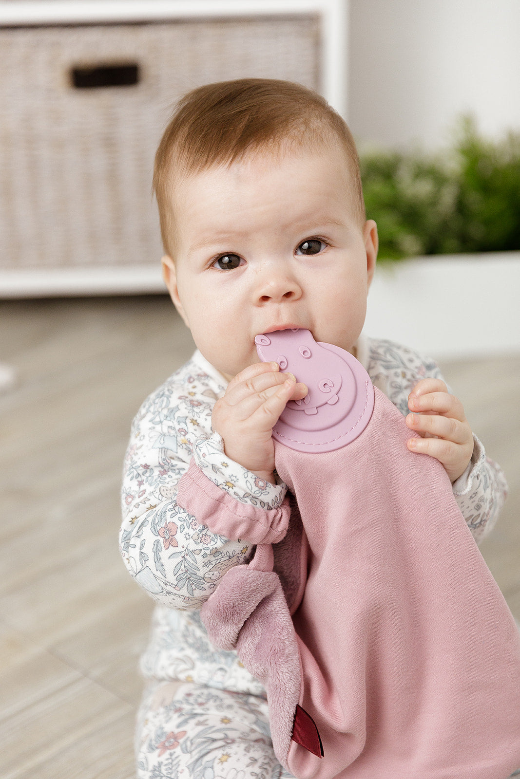 The attached signature hippo teether is designed to massage and soothe those tender little gums and is 100% safe to chew.