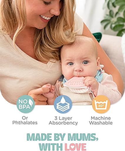 “Would definitely recommend this bib. Lovely design, soft material but totally absorbent, and the attached teether Is a genius idea!