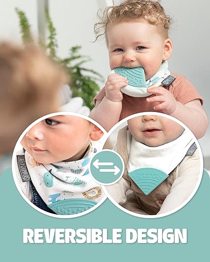 Perfect combo of designs! This award winning chewy teething dribble bib is packed with smart features to safely ease your baby's teething troubles away.
