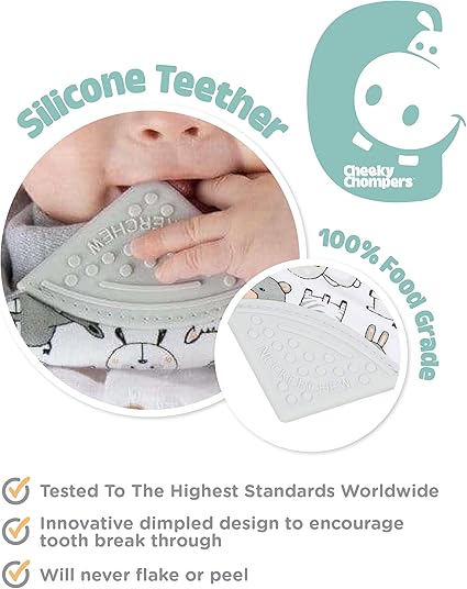 Perfect combo of designs! This award winning chewy teething dribble bib is packed with smart features to safely ease your baby's teething troubles away.