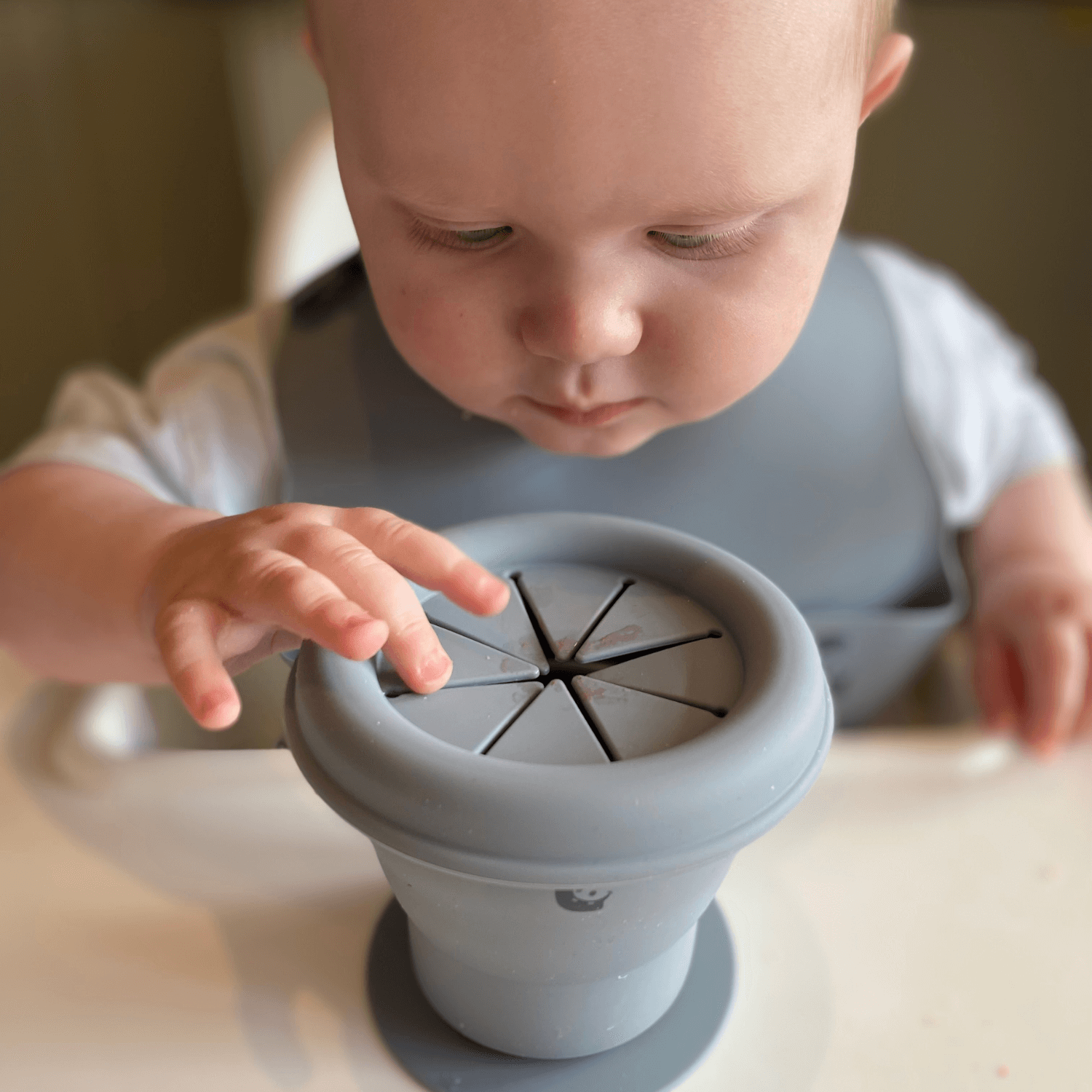 • Silicone collapsible snack pot with lid - this collapsible, space saving snack pot helps keep snack time less messy, keeping snacks accessible for little hands without the contents escaping!
