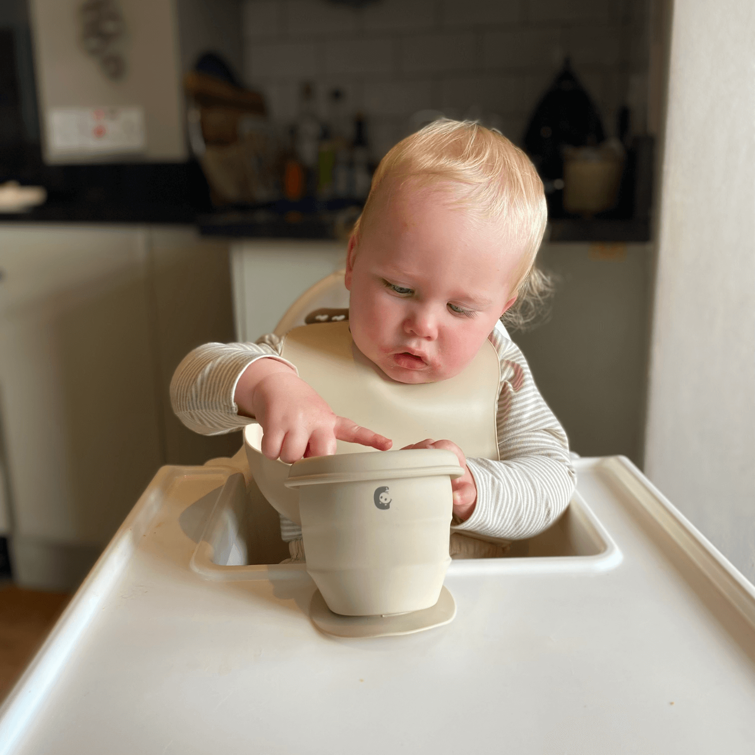 • Silicone collapsible snack pot with lid - this collapsible, space saving snack pot helps keep snack time less messy, keeping snacks accessible for little hands without the contents escaping!
