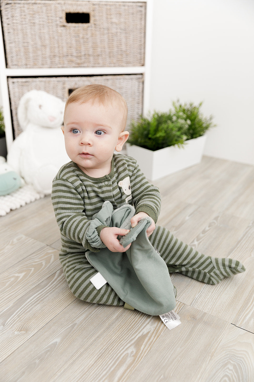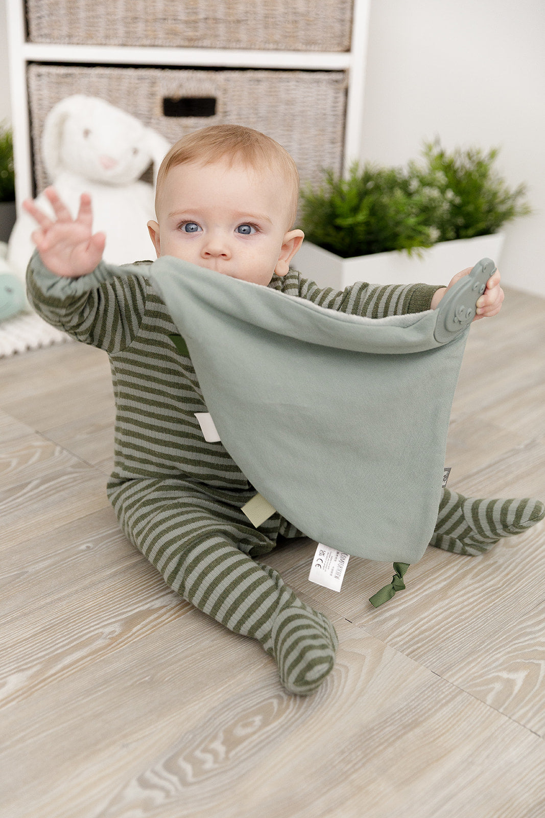 Our baby comforter has an elasticated strap for attaching to your baby's wrist, pushchair or car seat strap, so it stays in place when out and about.